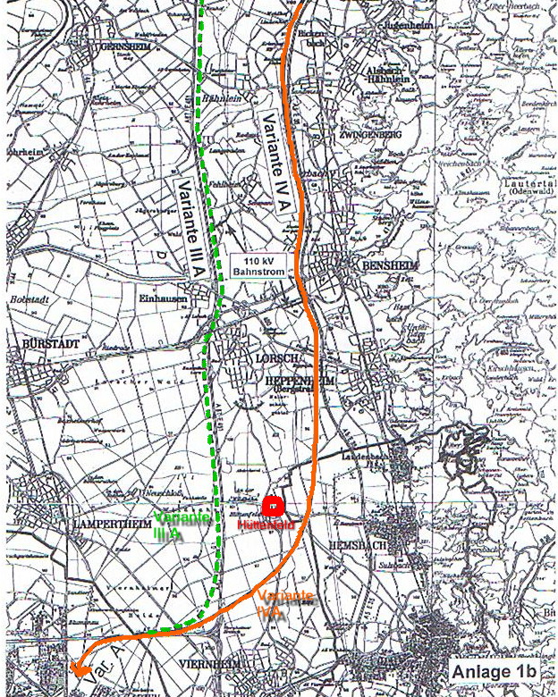 Streckenvarianten gab es viele, von I bis V und von A bis C. Seit die Variante C, die sogenannte Mark'sche Variante, vom Tisch ist und nicht ins Raumordnungsverfahren einging, ist Hüttenfeld nun auf alle Fälle von sämtlichen noch bestehenden Varianten betroffen! Die anscheinend "gestorbene" Variante C wäre ab der A67 von Lorsch über Neuschloss zur bereits bestehenden Riedstrecke geführt worden, also weiter weg von Hüttenfeld, siehe Bild. Hüttenfeld habe ich dort übrigens nachträglich eingezeichnet, denn unser kleiner Ort taucht in den schönen Trassenplänen leider so gut wie nie auf. Vergessen?