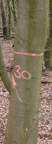 Vielleicht ist es heute schon “normal”, die Bäume mit ca. 30 -40 cm großen Zahlen in leuchtenden Farben vollzusprühen. Da hört mein Verständnis jedenfalls auf. Denn die forst- und jagdbetriebliche Aufgabenerfüllung könnte man sicherlich auch anders wahrnehmen.
