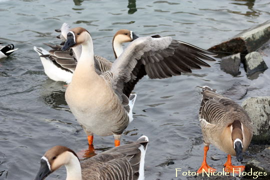 Familie der Entenvögel (Feldgänse) 1956 kreuzten Holländer Schwäne mit Höckergänsen, und so entstand die Schwanengans. Diese kreuzen sich auch öfters mit Graugänsen. Größe: Brut: Mai, 5-8 Eier, Vorkommen: Gewässer, Auen Ernährung: Wasserpflanzen, Gras, Kräuter, Samen, Wurzeln und Ausläufer von Sumpfpflanzen Foto links und unten: Nicole Hodges Jan 2009 |