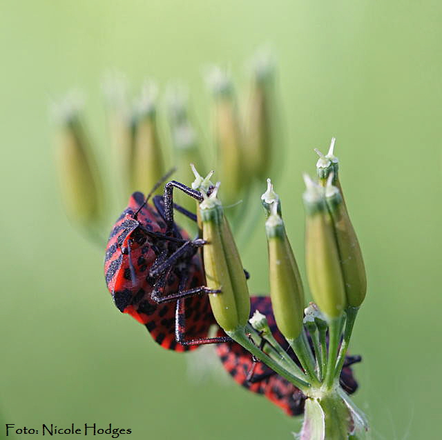 Familie der Baumwanzen Kommt aus dem Mittelmeerraum und liebt Wärme. Vorkommen: August - Juni Größe: 8 - 12 mm Vorkommen: Warme Wiesen und Böschungen Ernährung: Pflanzensäfte von Doldenblütern Überwinterung: Erwachsene Foto links: August 2008, |